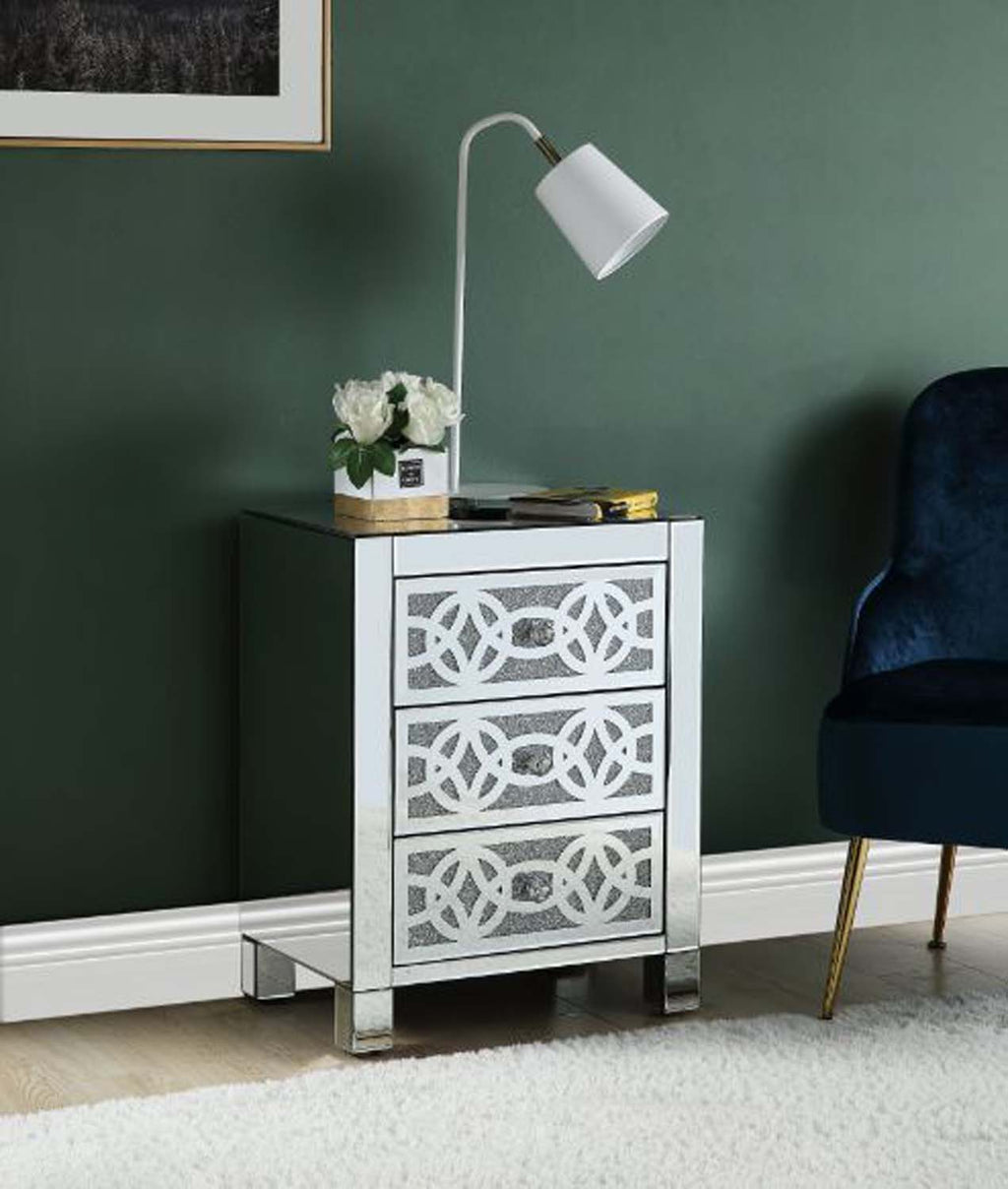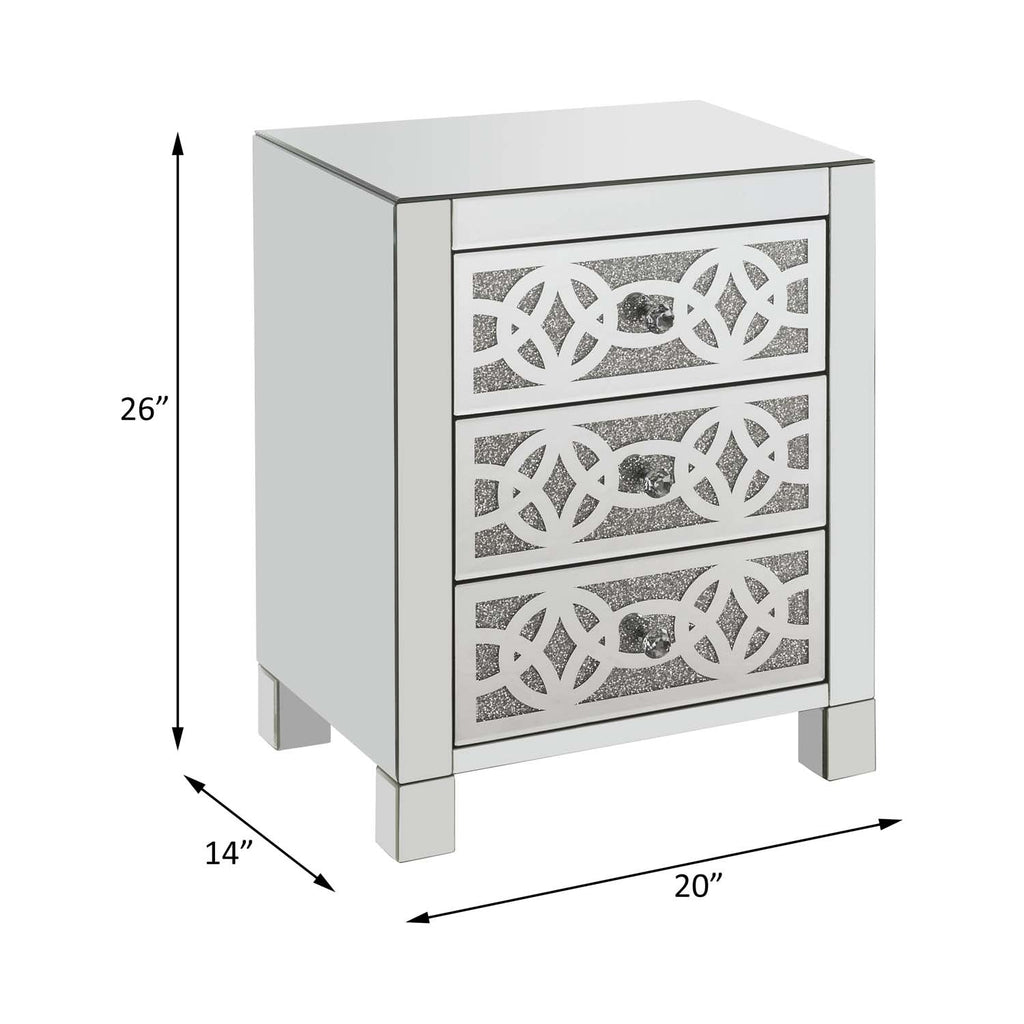 The Noralie Accent Table will give any room a touch of glamour. Mirror and glass materials give it a modern and clear touch while faux diamond inlays add glam style to this piece. Use this unique piece as the perfect accent for any room decor. It has three storage drawers with self closure and safety stop, providing ample and convenient storage for small electronics, cosmetics, accent items, jewelry, and more.