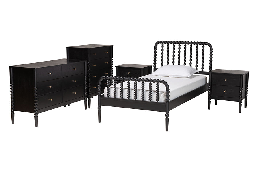 The vintage artistry of the exuberant Laverne bedroom set creates an environment of traditional flair. Made in Malaysia, this mid-century inspired set includes one bed, one dresser, one chest, and two nightstands crafted from sturdy wood. Turned bobbin embellishments envelop each piece for a captivating display rich with classic charm. The Laverne requires assembly and utilizes wood slats for mattress support, eliminating the need for a box spring. Tapered legs highlight the vibrant geometry of each piece, making the Laverne bedroom set a marvelous arrangement.