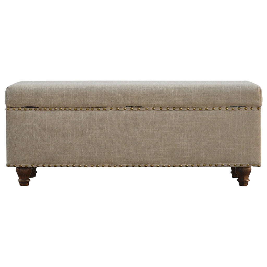 Add some glamour and touch to your home with this hallway bench. It features a lid-up storage which is useful for storing any unwanted items out of sight , and a piping around the edges with beautiful studded detailing to add some character to the piece. It has been upholstered in cream linen and stands on 4 walnut-finished feet. A perfect addition the the home.