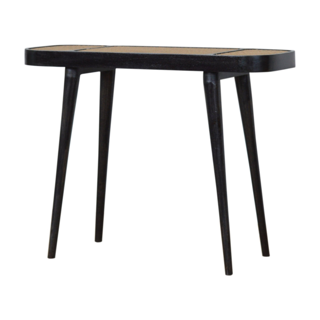 This console table has been beautifully made from 100% solid mango wood in a ash black finish with a hand-woven rattan top. Featuring rounded corners, the console table can be used in a variety of settings such as the bedroom, hallway or living room. Perfect for storing pieces like flowers, photo frames etc.