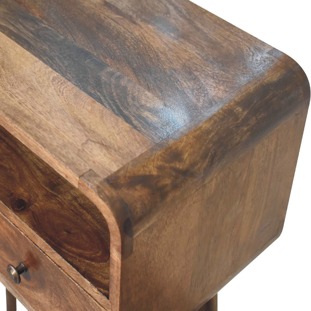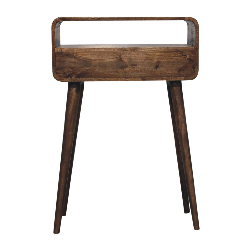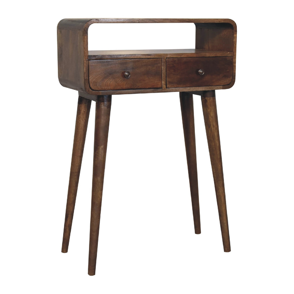 This mini simple, elegant console table has beautifully curved edges to fit perfectly in any home or living space, suiting most interiors, this 100% solid mango wood unit has been built with sustainably sourced timbers and has two drawers and 1 open slot to help you keep your home organised and storing any little household objects. It has shiny knobs and has a fine grey washed finish with 4 Scandinavian style legs. This petite product is a part of Recession Collection.