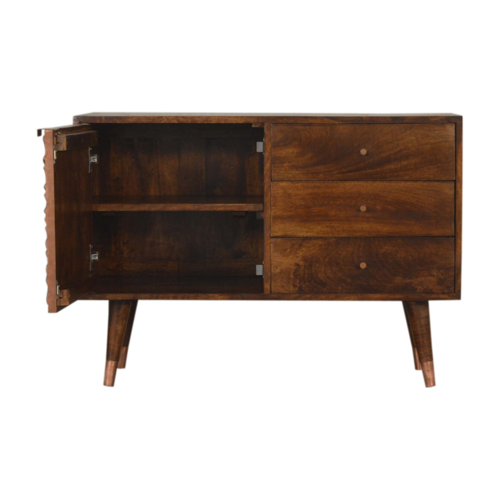 This Manila Copper Chestnut Sideboard was designed to add a touch of elegance and charm to your home. It features a copper-inlay plated cabinet and 3 drawers along with Nordic-style cap feet, it has been constructed from 100% solid mango wood and offers a rich chestnut finish, other features include pull-out handles along with surface space on top to uplift your living room or hallway.