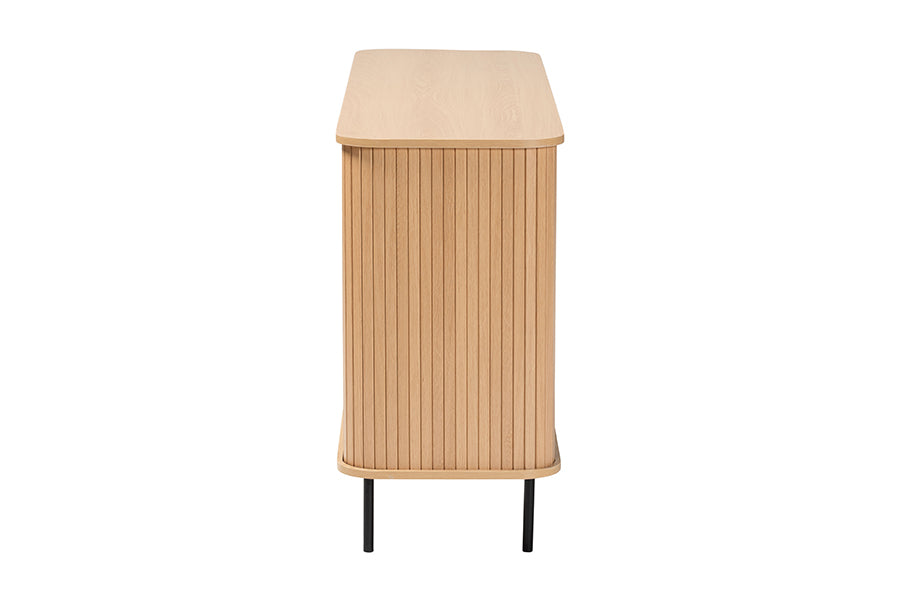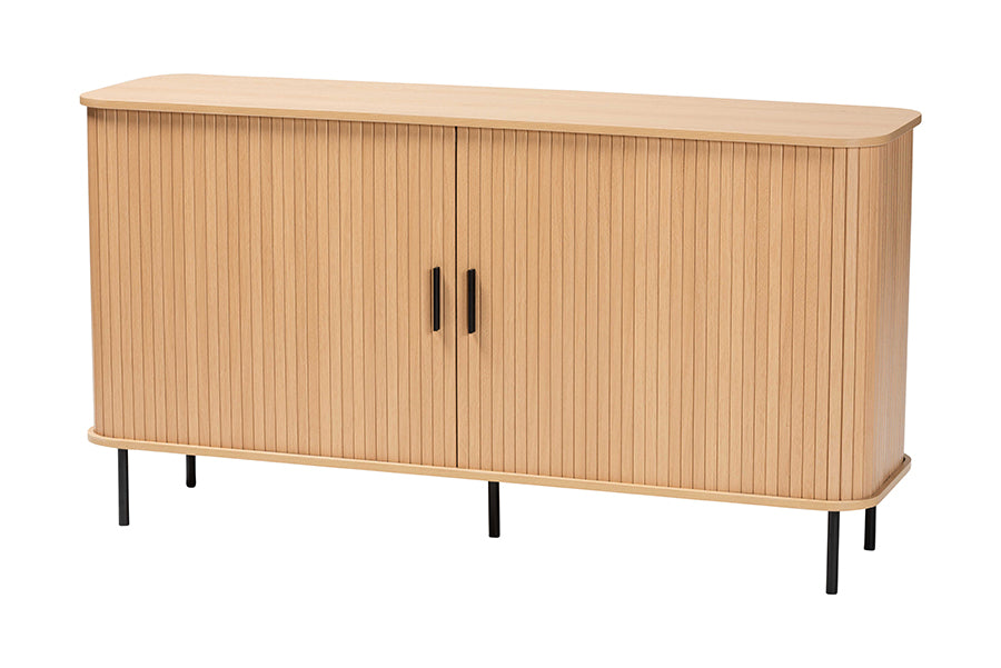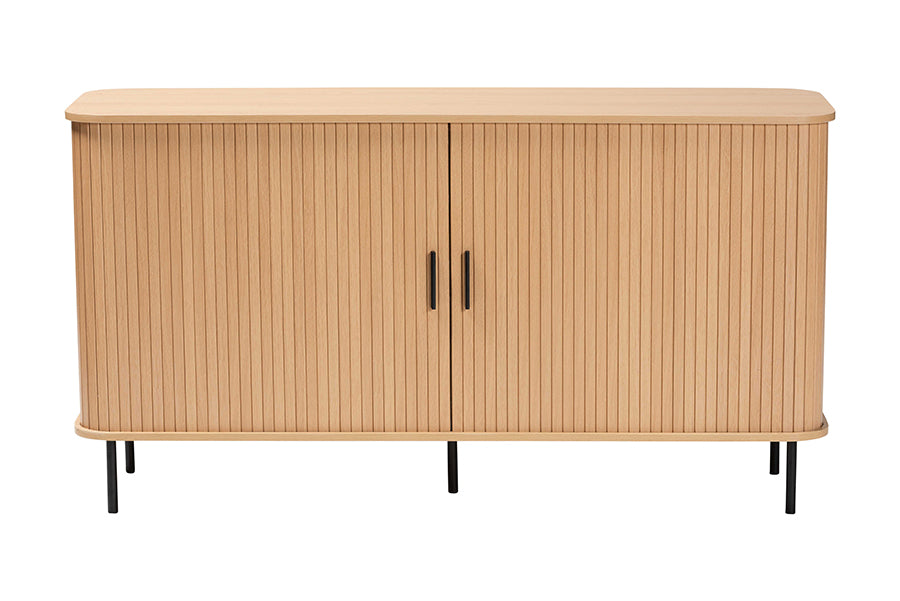 The beauty and functionality of mid-century design arrive in the form of the Dominic sideboard. Adeptly crafted in China, this classic design is comprised of sturdy wood embellished with metal handles for an added touch of sleek industrial flair. Its wide, oval tabletop serves as a fantastic display area while the sliding tambour doors open effortlessly to reveal four shelves perfect for organizing cookware and utensils. The Dominic requires assembly and features a fluted wood exterior for a textured display rich with artistic presence. Minimalist metal legs complete the look, making the Dominic sideboard a fantastic addition to any layout.