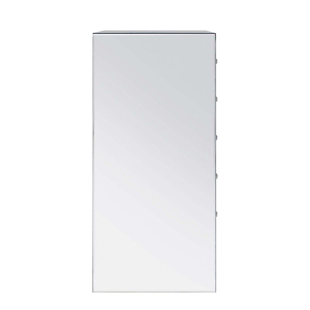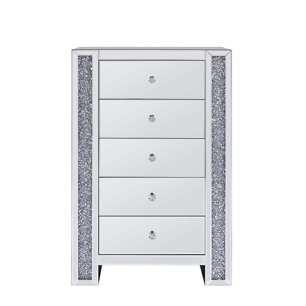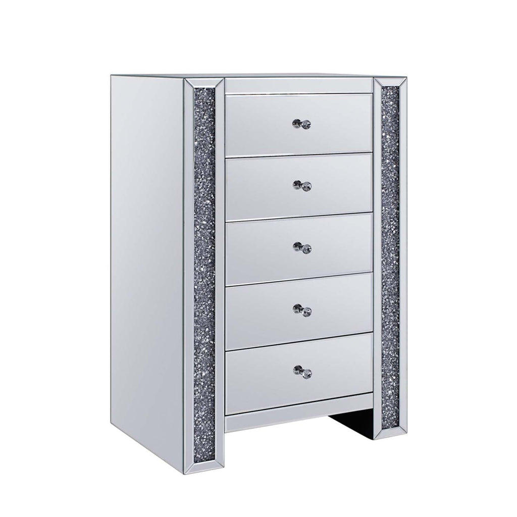 The Noralie Console Table will give any room a touch of glamour. This contemporary table is fully mirrored with a stunning mirror top and a faux diamond inlay on each leg of its sled base. Use this unique piece as the perfect accent for any room Decor. Five large drawers provide ample and convenient storage for small electronics, cosmetics, accent items, jewelry, and more.