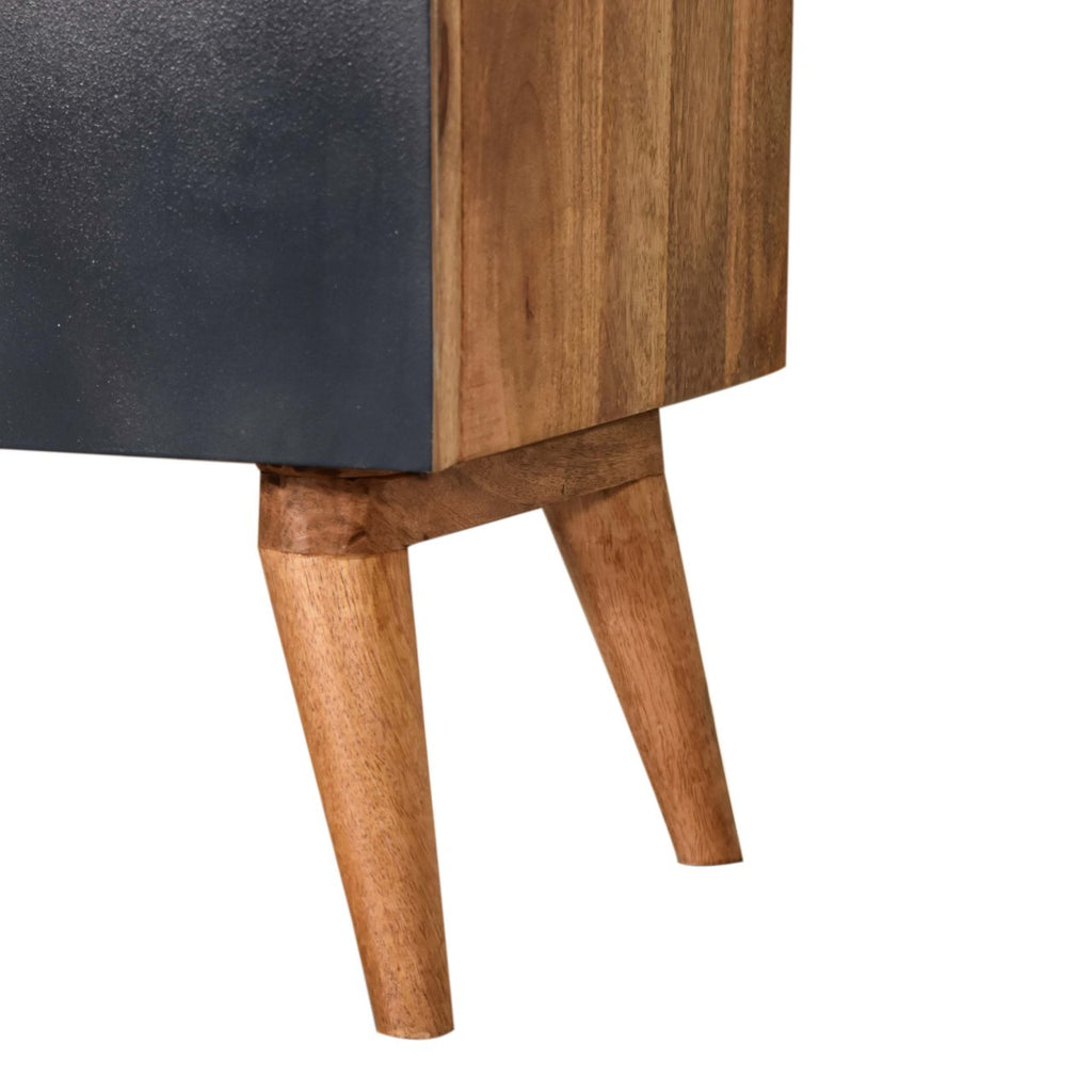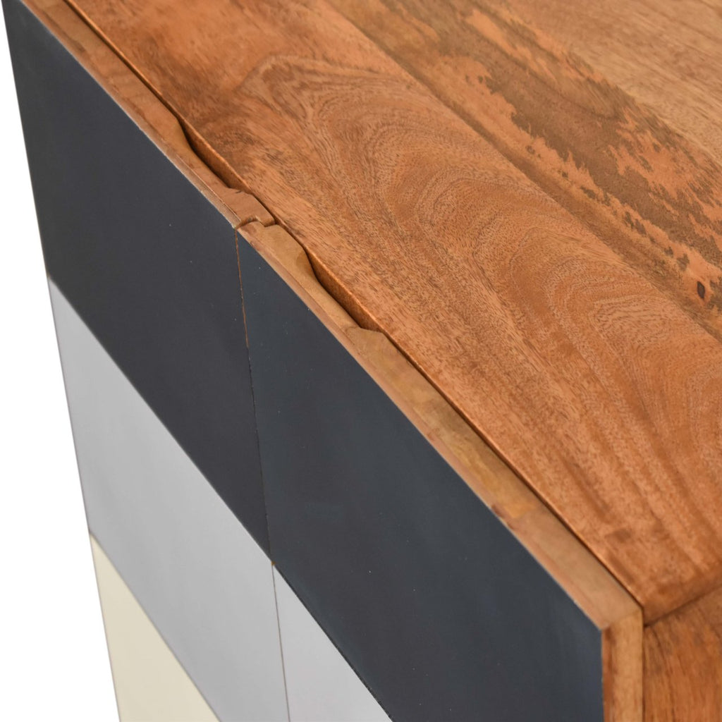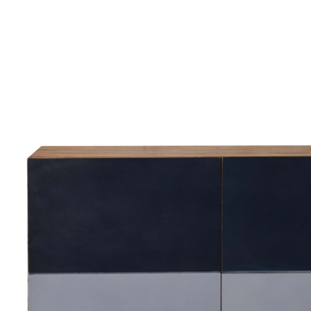 Offering a clean, sharp L pattern and hand-painted in 3 rich shades of blue this cabinet offers plenty of room on top for a candle, ornament, or plant. Storage is offered with two doors which can be used to easily store bits and pieces and keep them close and handy. Other features include Nordic style legs and the body is constructed from 100% solid mango wood.