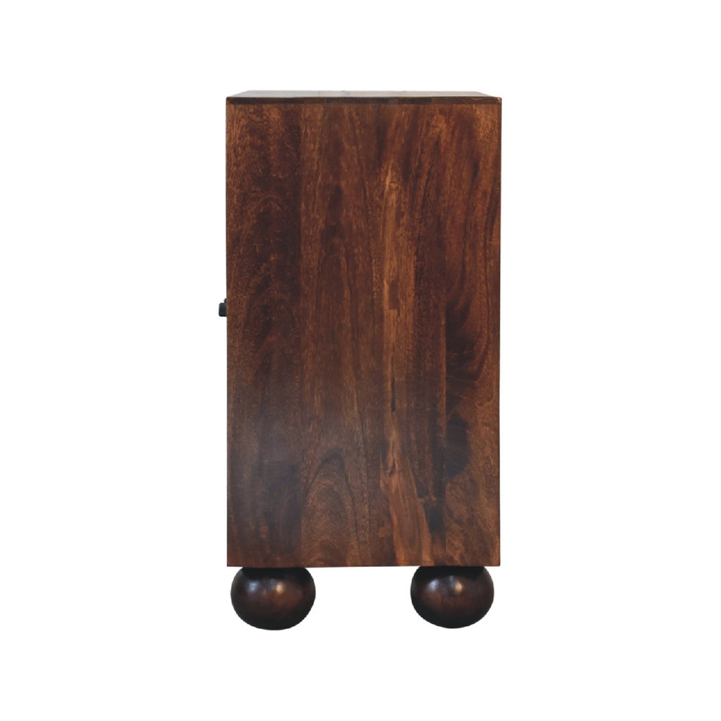 This functional cabinet is designed with 2 reclaimed wood doors, that provide convenient storage space inside for your living room bits. It has been constructed from 100% solid mango wood in a walnut finish with a sunrise pattern followed by shiny brass candle knobs and ball feet. Offering a modern retro aesthetic, this media unit is a timeless option for your home.
