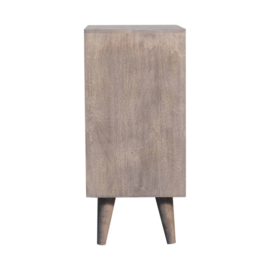 This mini cabinet has been constructed from 100% solid mango wood and has a fine stone finish. Its pineapple-carved design gives the product a unique twist and provides enough space with 2 doors that offer useful storage. Other features include shiny knobs and 4 Nordic style feet. This cabinet is the perfect addition to any home.