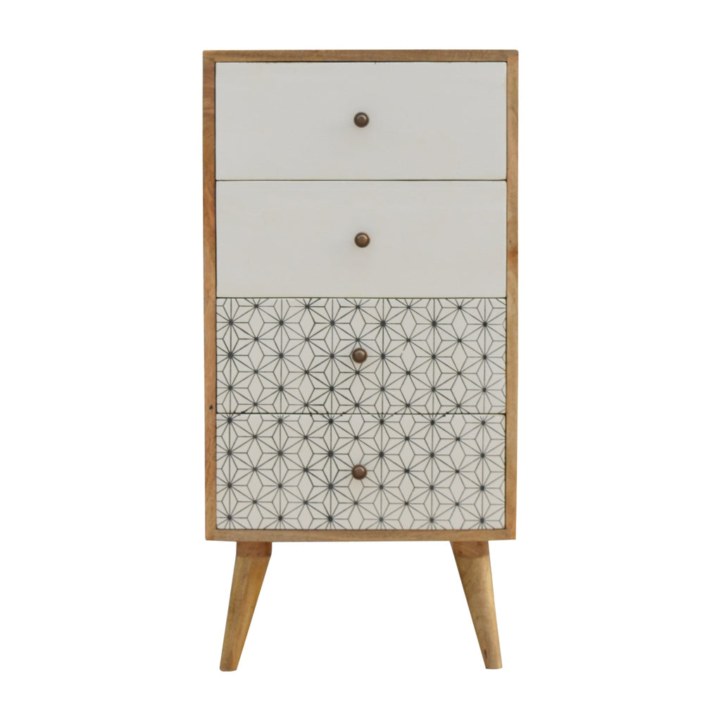 This tallboy has been constructed from 100% solid mango wood and finished in a fine oak-ish finish. The main features of this piece are the 2 screen printed drawer fronts which have a beautiful, geometric design giving the piece extra dimension and character. Useful storage is provided with all 4 drawers to discreetly store keep any bits and pieces. It also has 4 Nordic-style legs and 4 shiny knobs.