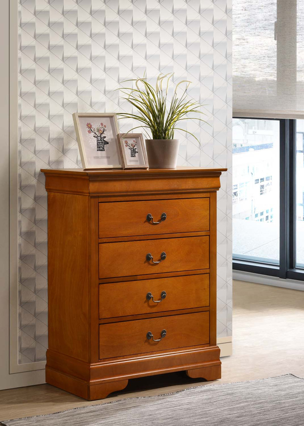 - Smooth drawer fronts with classic pull handles for easy opening and closing