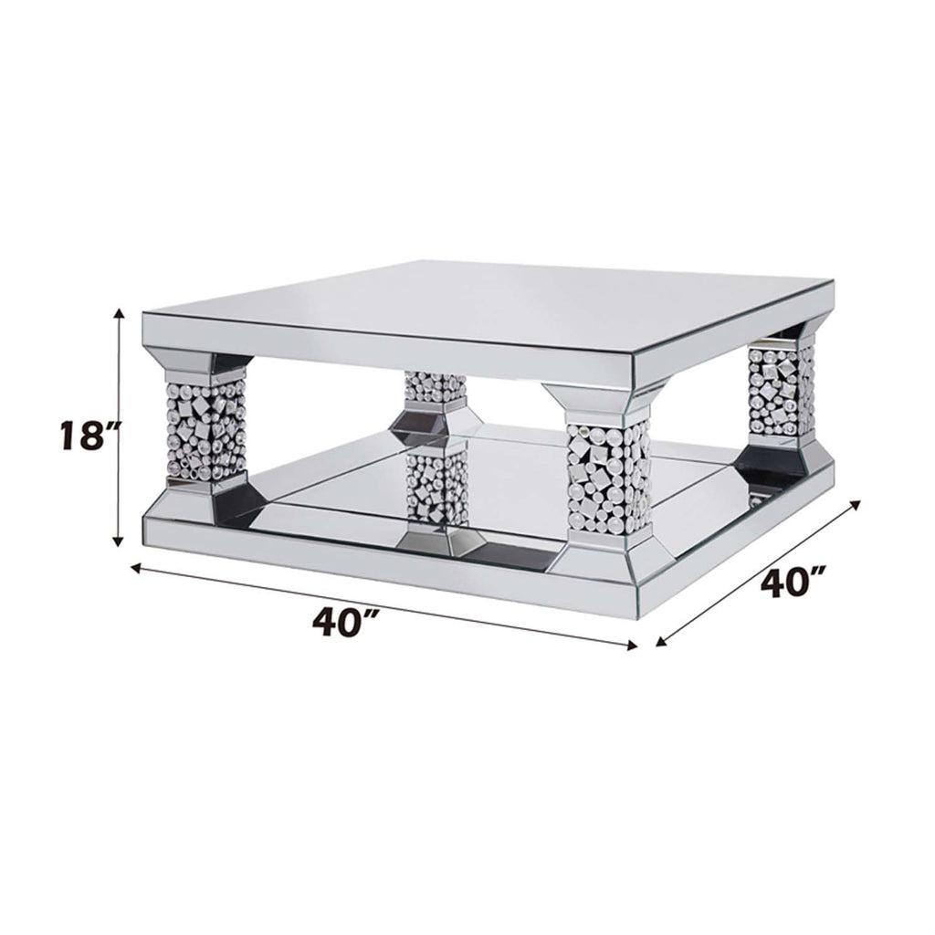 The Kachina Coffee Table will add a contemporary touch to any room in your home. With its clean lines, this brilliant rectangular occasional table showcases a distinctive style for an intriguing look. The table features a fully mirrored beveled frame with mirror base with columns encrusted with a spectacular faux gem inlay. A lower mirrored open shelf provides ample display and storage to keep items tucked out of the way when not in use. This beautiful accent table will modernize any space you place it.