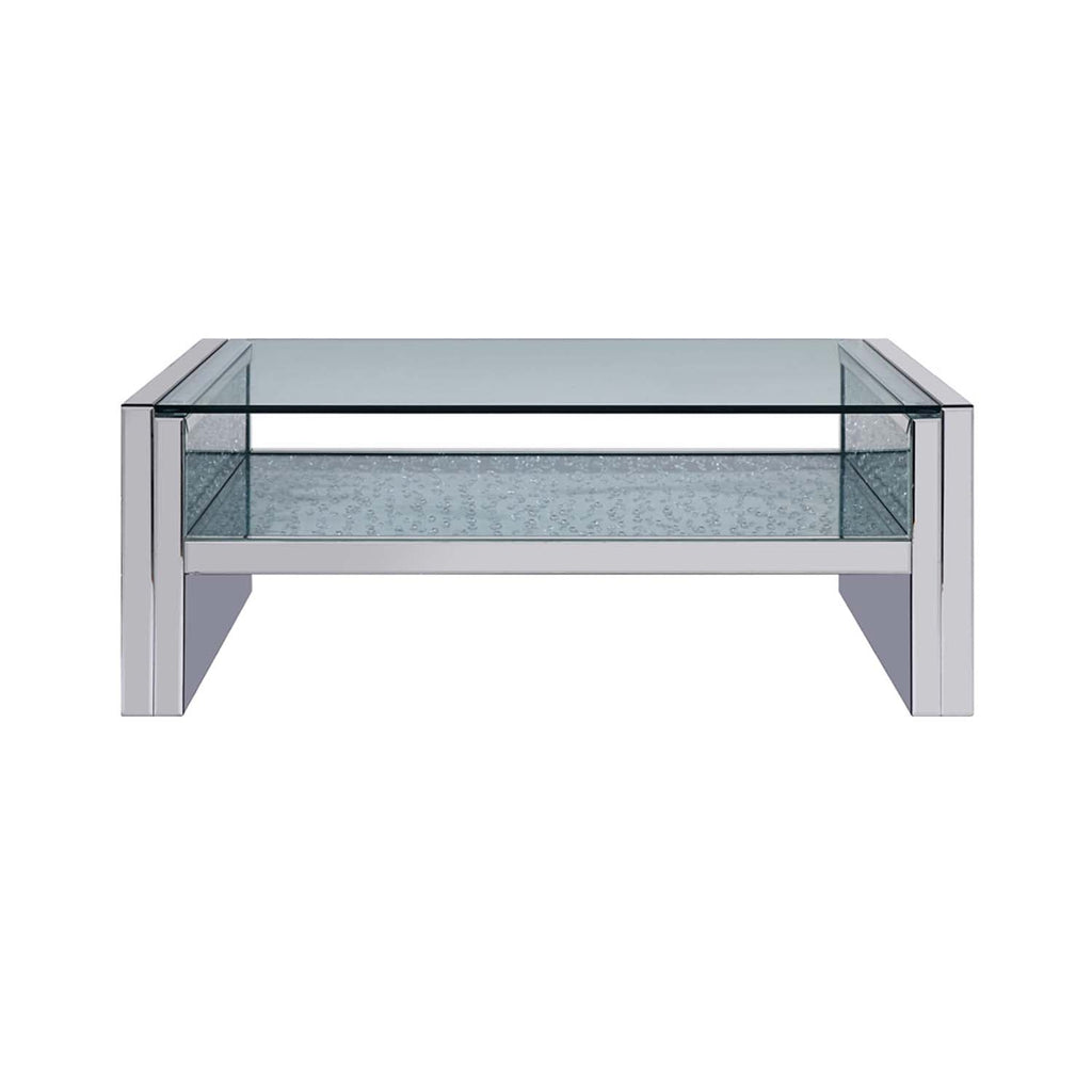 The Nysa Coffee Table will add a contemporary touch to any room in your home. With its clean lines, this brilliant rectangular occasional table showcases a distinctive style for an intriguing look. The table features a fully mirrored sled base with an exquisite beveled glass top. A lower mirrored shelf with a spectacular faux crystal inlay provides ample display and storage to keep items tucked out of the way when not in use. This beautiful accent table will modernize any space you place it.