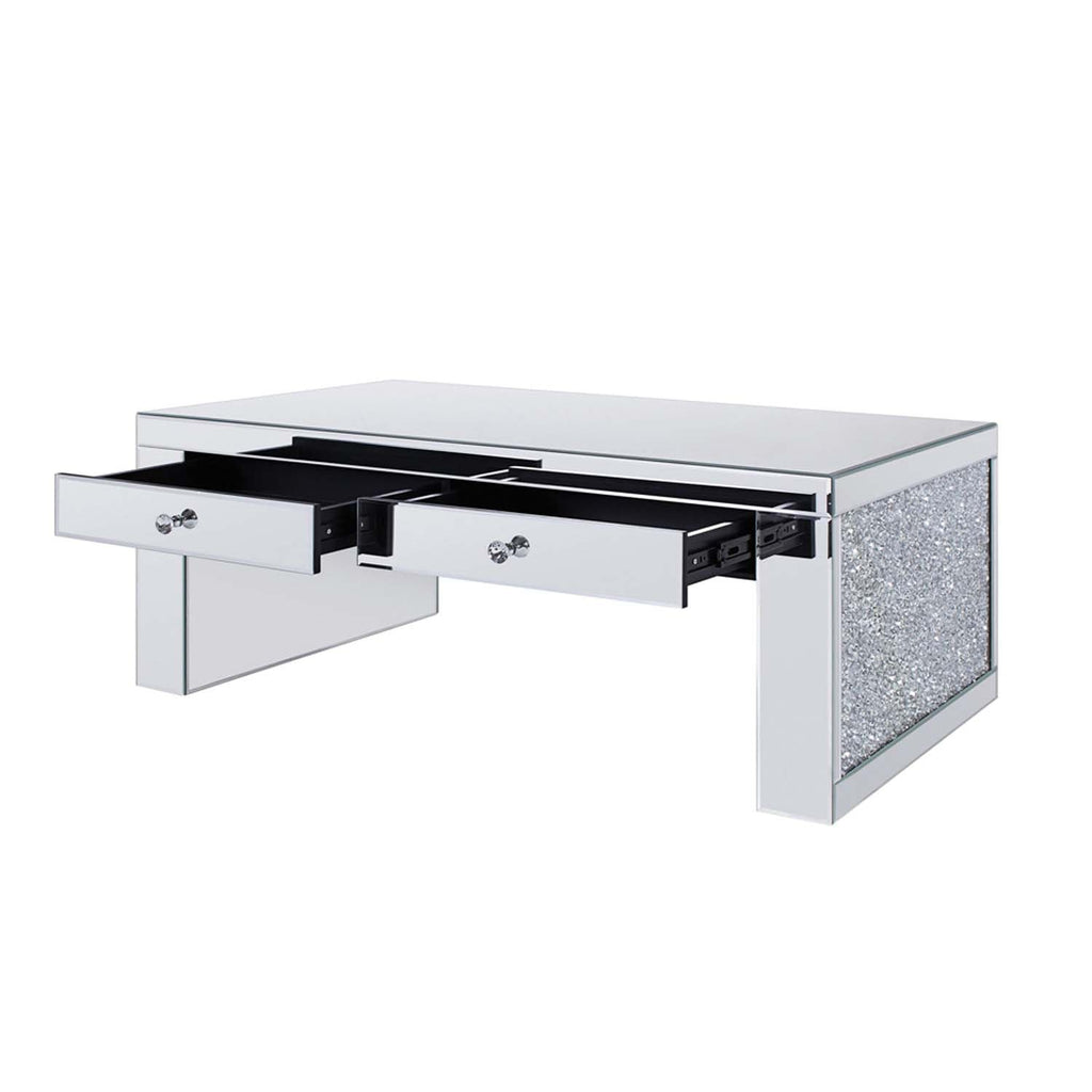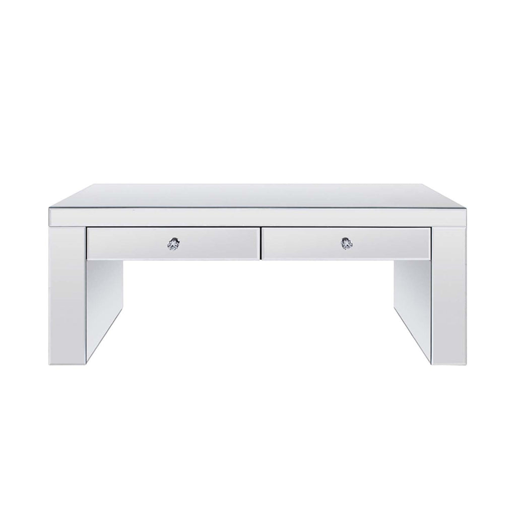 The Noralie Coffee Table will give any room a touch of glamour. This contemporary coffee table is fully mirrored with a stunning mirror top and a faux diamonds inlay on each leg of its sled base. Use this unique piece as the perfect accent for any room Decor. Two storage drawers provide ample and convenient storage for makeup brushes, jewelry, and more.
