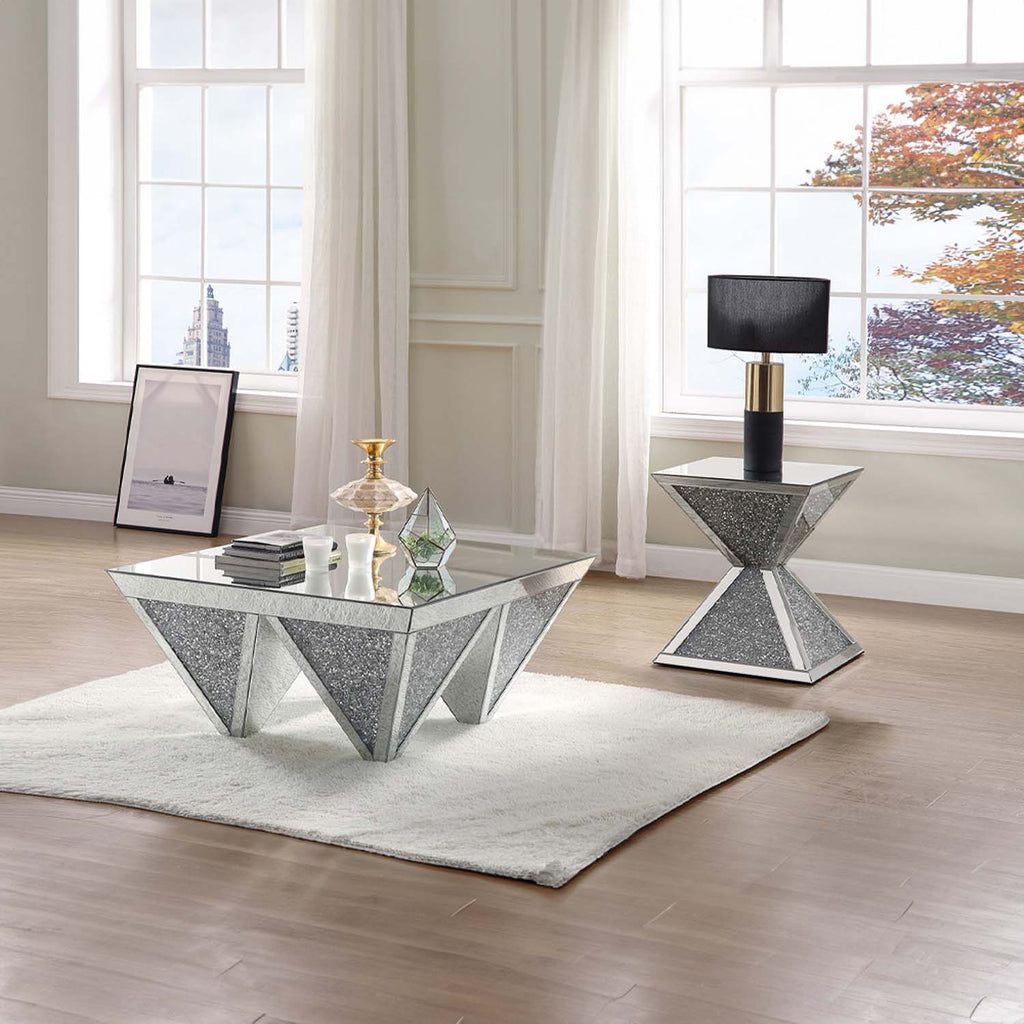 - Features: Mirrored Top, Geometric Base w/Faux Diamonds Inlay & Clear Glass