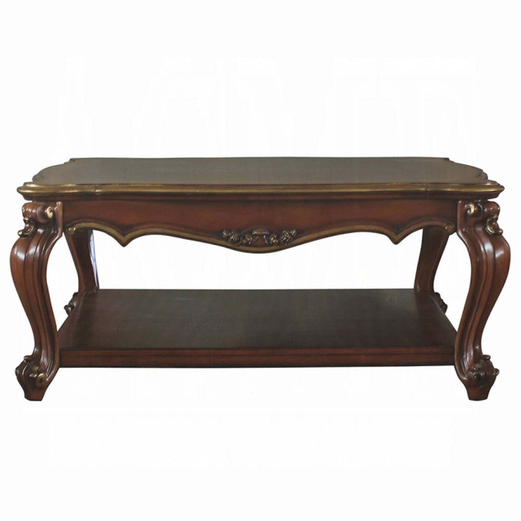 - Features: Wood Scalloped Top & Shelf, Oversized Queen Anne Legs with Oversized Molding Trim w/Antique Brushed Finish