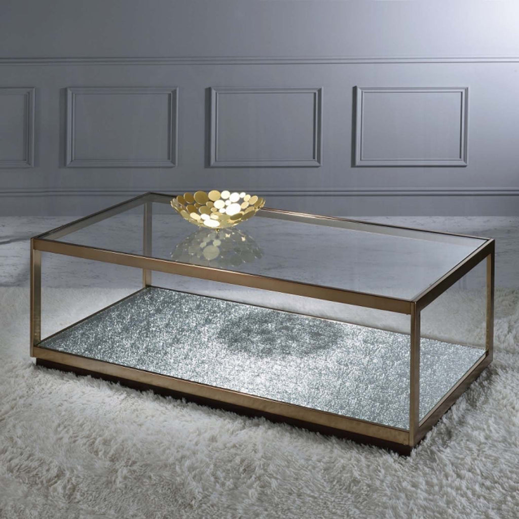 This Kaia coffee table features an elegant glass top and a sleek metal base, providing a modern and sophisticated touch to any living room. The glass top is tempered for added durability while the lower shelf features a textured surface, and creates a sense of lightness and airiness, making it an ideal choice for smaller spaces. The metal base is finished in a gold color. It features clean lines and a minimalist design, adding a touch of simplicity and sophistication to it.