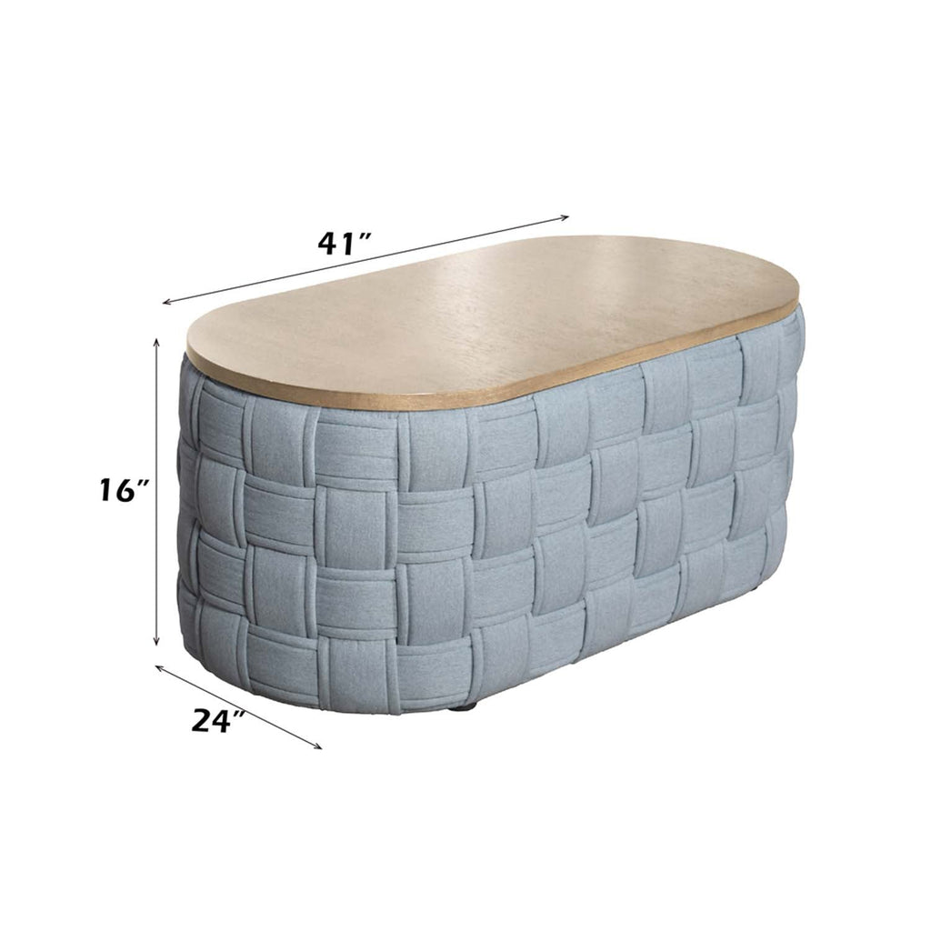 The Saree coffee table uses simple rounded lines to create a striking oval shape. The coffee table delivers a unique aura into any living space with its light teal chenille and natural wooden finish tabletop. The frame is designed using a unique knitting process that adds texture and depth; this makes the pieces bold and lively in appearance. This coffee table is the perfect finishing touch to any living space.