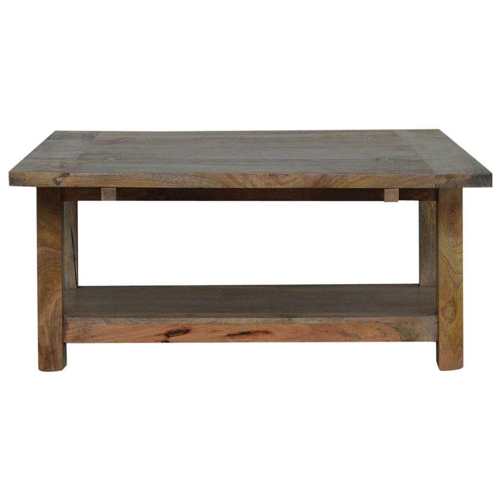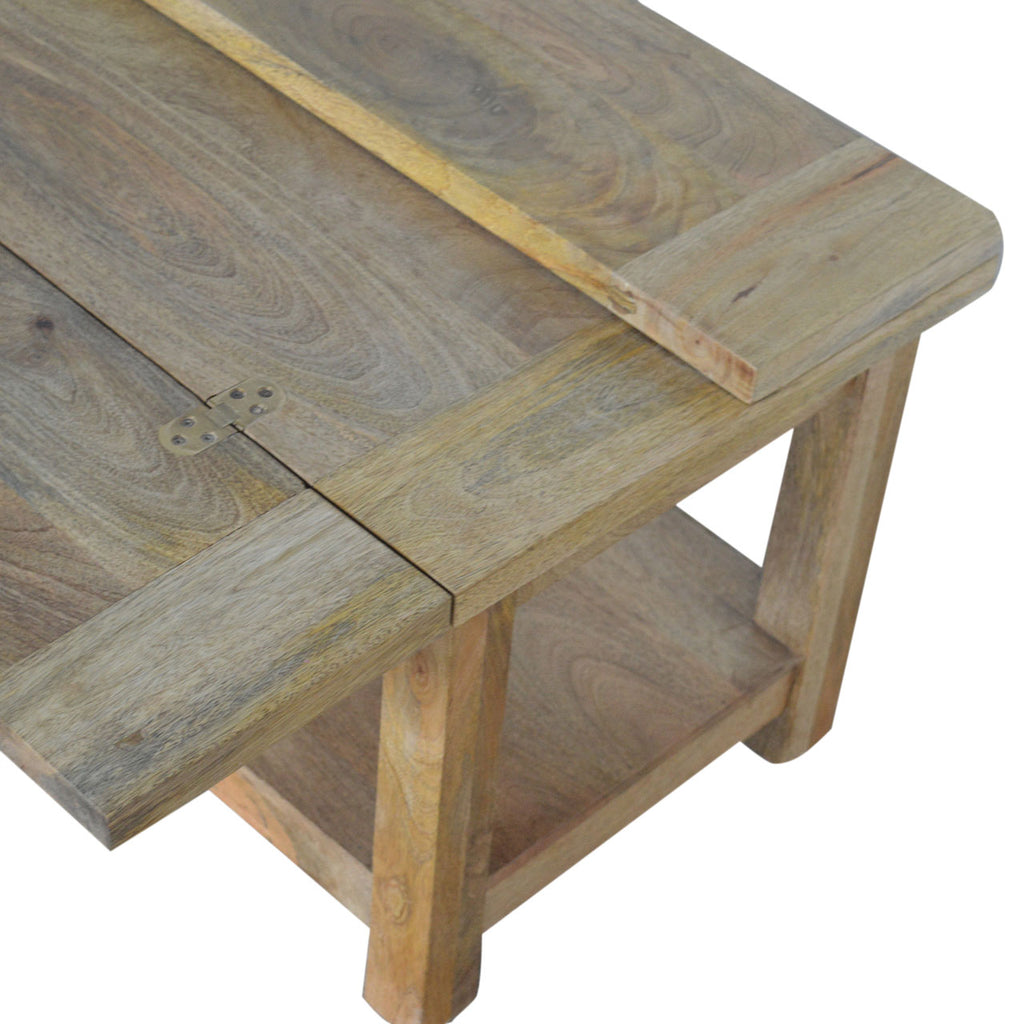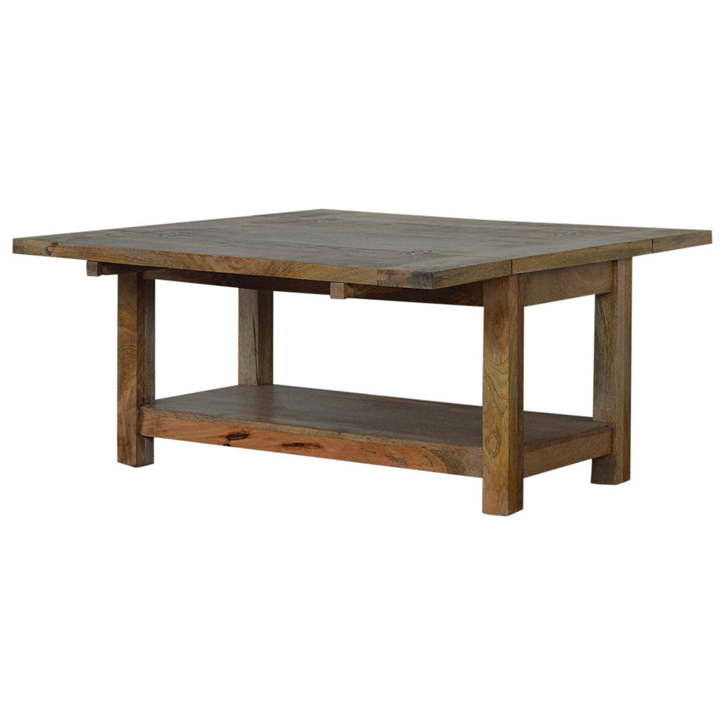 This solid wood Extending Coffee Table has an appealing rusticity and charm, constructed from 100% solid mango wood in an oak-ish finish, the no fuss finish reveals the beautiful grain of the fruit-wood mango wood which this beautiful piece of furniture is made of. Every piece of furniture is individually handcrafted and includes swing care tickets explaining the cautions and aftercare instructions.