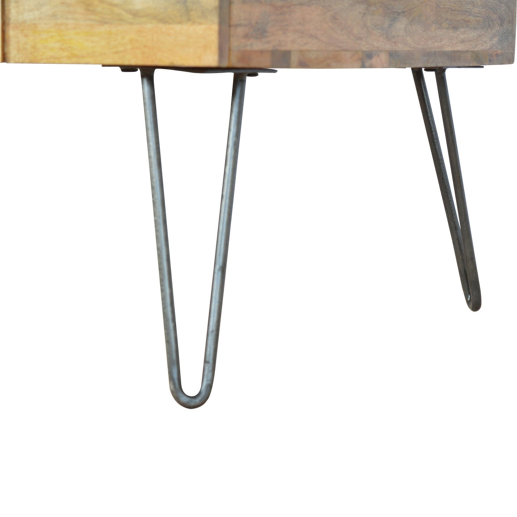 This solid wood industrial design central table is a fabulous addition to your home adding a more modern feel to your front room. It is constructed from 100% solid mango wood, and the base/legs are constructed from 100% metal Iron. Useful storage space is available with 2 drawers, a smooth oak-ish finish on the wood, triangular metal legs which have a pewter finish and shell handles.
