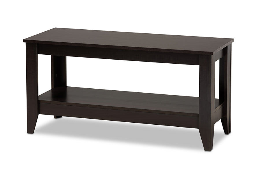 The clean, streamlined design of the Pierce coffee table makes it an easy addition to any living room. This wood table features a spacious tabletop, perfect for a potted plant and a cup or two or espresso. A lower shelf provides space to display books, magazines, and more. Its dark wenge brown finish and tapered legs give the table an elegant, modern feel. The Pierce coffee table is made in Malaysia and requires assembly.