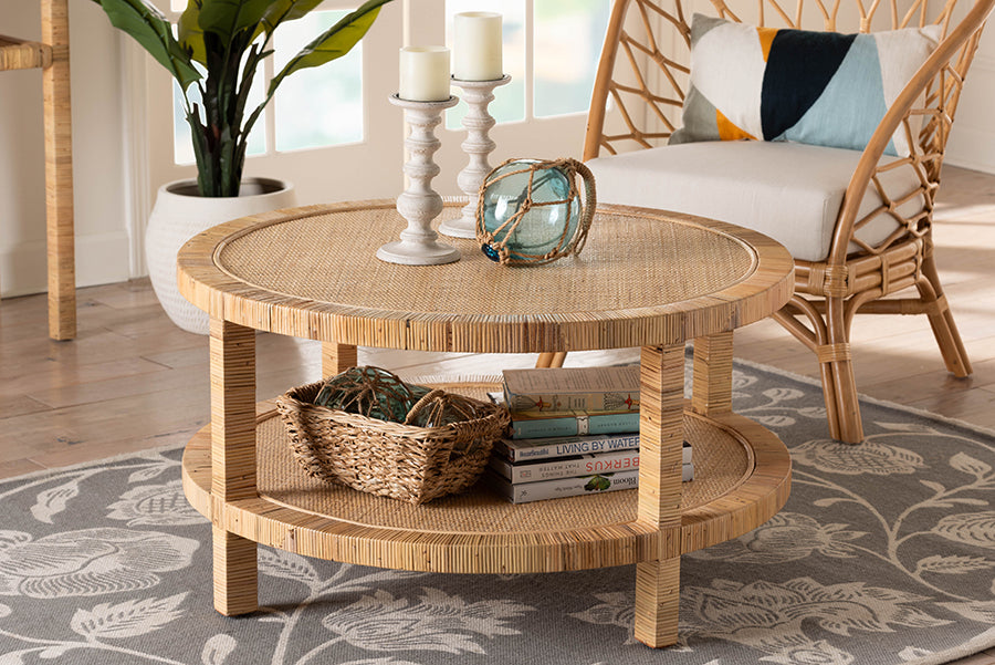 Enjoy an air of refreshing exotic ease in your space with the stunning Giolla coffee table. Made in Indonesia, this bohemian piece consists of a solid Mahogany wood frame wrapped in natural rattan. Its spacious tabletop utilizes a broad, round silhouette to adeptly complement a variety of room layouts while the open shelf offers convenient storage space. The Giolla will arrive fully assembled and features straight legs that provide excellent stability and support while producing rich geometric charm. A sleek rendition of rustic craftsmanship, the Giolla coffee table beautifully anchors any space.