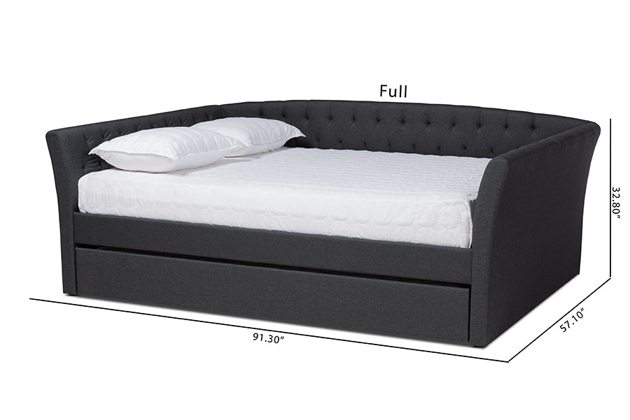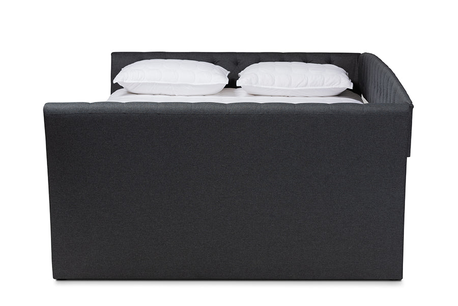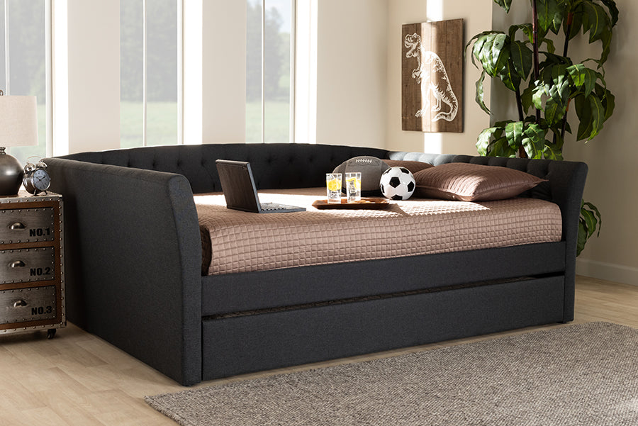 A comfortable place to lounge or sleep, the Jackson daybed brings versatility to any space. This wood daybed is upholstered in a soft, resilient polyester fabric and is padded with foam for the utmost comfort. Flared arms and elaborate button tufting lend a classic, refined look. Designed for both style and function, the Jackson is fitted with a roll-out twin size trundle bed to provide convenient accommodation for overnight guests. The Jackson daybed is made in Malaysia and requires assembly.