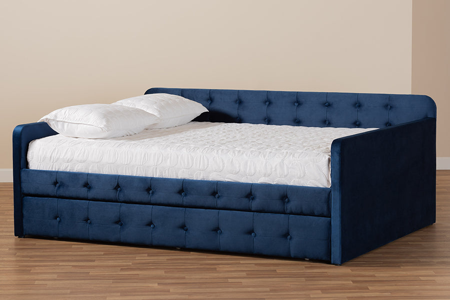 Set up an elegant environment for lounging and sleeping with the Avery daybed. Made in Malaysia, this wooden daybed is upholstered in a soft, luxurious velvet fabric and padded with foam for the utmost comfort. Sleek track arms display a modern look, while button tufting lends a classic touch. Designed with both style and function in mind, the Avery is fitted with a roll-out twin size trundle bed to provide easy accommodation for overnight guests. Requiring assembly, the Avery is well suited for guest rooms and children’s rooms.