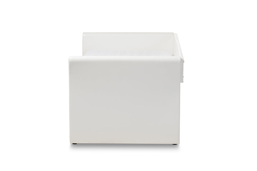 The Matilda modern and contemporary white faux leather upholstered daybed with guest trundle bed is all about refined comfort and adding an element of style to your home while also providing an ideal place to unwind, lounge or relax. Constructed of solid wood frame and upholstered in white faux leather, these elements give the daybed a stylish look. The Matilda is all about delivering comfort and has been fitted with a generous high density foam filling to ensure the most comfortable space possible. The daybed also features flared arms with camel-shaped back panel, for an extra element of style and comfort. Offering a number of different styling solution, this versatile 3-in-1 furniture multitasks as a daybed, sofa and guest bed. For studio apartment and condominium where space is limited, the barnstorm could be your reading nook during the day time while transforming into your guest bed for two by rolling out the trundle. In your living room, family room or home office, the daybed is a good option for extra seating space during day time while transforming into guest bed for two at night. Made in Malaysia, the daybed requires assembly.