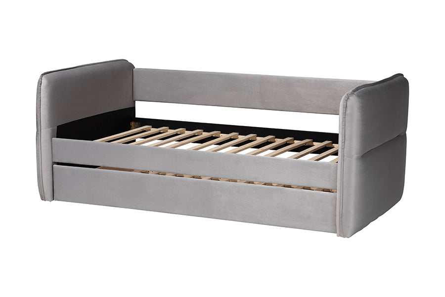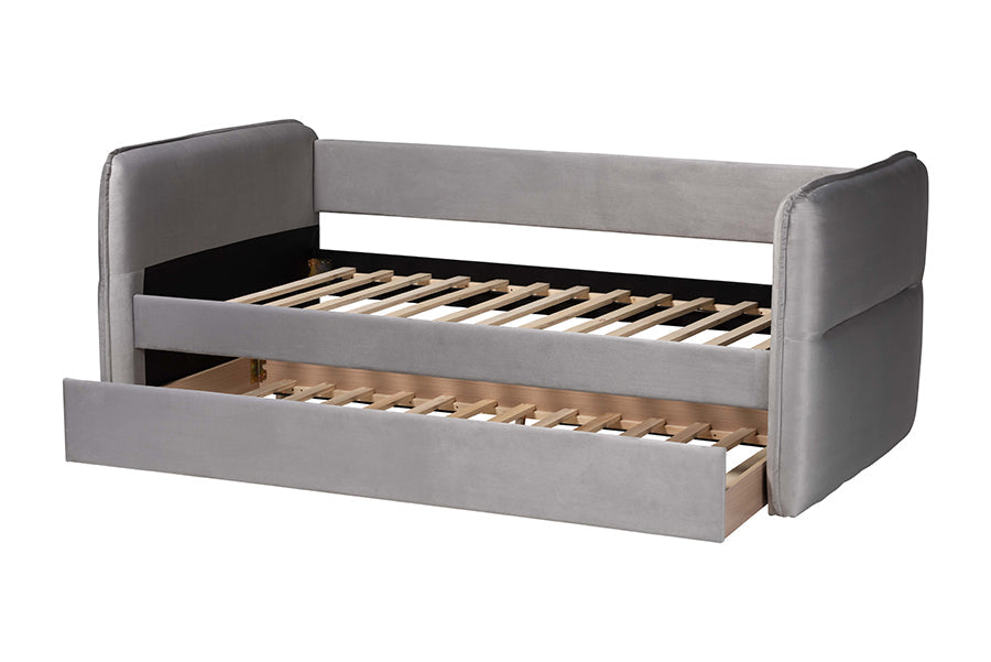 Manifest serene leisure in your space with the tranquil nature of the Parkin daybed. Made in Malaysia, this contemporary piece consists of a sturdy wood frame generously padded with plush foam and upholstered in sumptuous velvet fabric. The soft, pillowy frame presents a scene of serenity while line tufted embellishments lend a touch of chic refinement to the piece. The Parkin requires assembly and utilizes wood slats for mattress support, eliminating the need for a box spring. Equipped with a trundle to accommodate guests, the Parkin daybed redefines any arrangement with graceful poise.