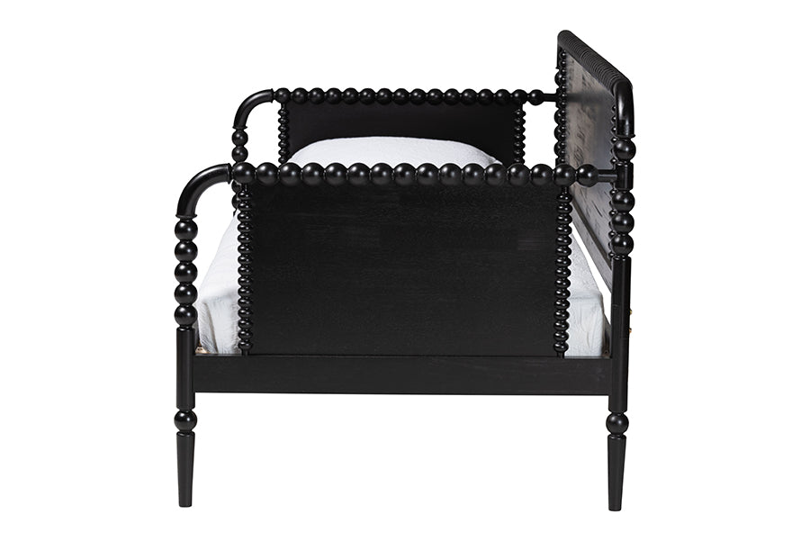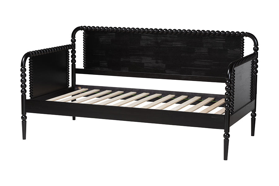 The vintage artistry of the exuberant Laverne daybed creates an environment of traditional flair in your space. Made in Malaysia, this mid-century inspired piece is crafted from sturdy wood. Turned bobbin embellishments envelop the slatted wood headboard and accent footboard for a captivating and welcoming display. The Laverne requires assembly and utilizes wood slats for mattress support, eliminating the need for a box spring. Tapered legs highlight the vibrant geometry of the piece, the Laverne daybed is a perfect addition for any bedroom or guestroom.