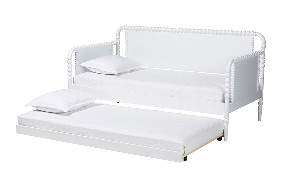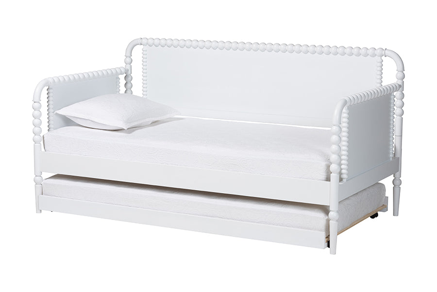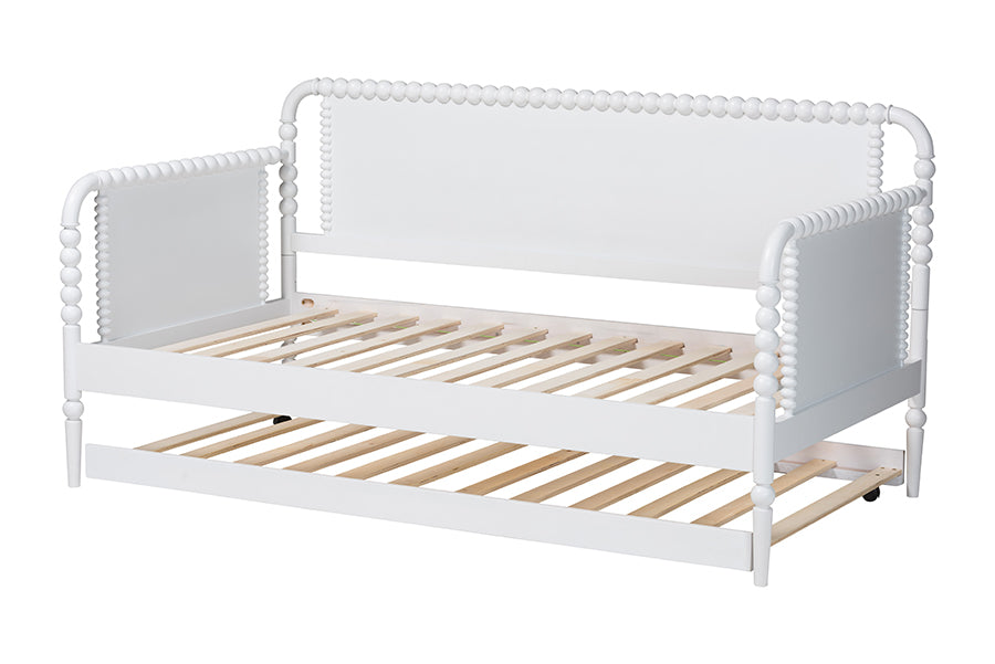 The vintage artistry of the exuberant Laverne daybed creates an environment of traditional flair in your space. Made in Malaysia, this mid-century inspired piece is crafted from sturdy wood. Turned bobbin embellishments envelop the slatted wood headboard and accent footboard for a captivating and welcoming display. The Laverne requires assembly and utilizes wood slats for mattress support, eliminating the need for a box spring. Tapered legs highlight the vibrant geometry of the piece, the Laverne daybed is a perfect addition for any bedroom or guestroom.