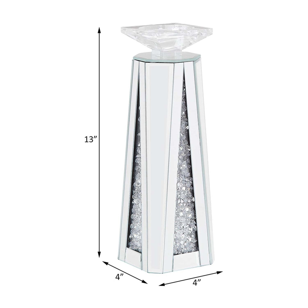 With a modern silhouette and mirrored finish, this Nowles candleholder collection adds instant warmth and ambiance. Crafted with a mirrored frame and faux gem inlay, it creates an elegant look and a soothing atmosphere for your guests. Available in two different sizes, this piece will create a unique and nostalgic effect on the environment.