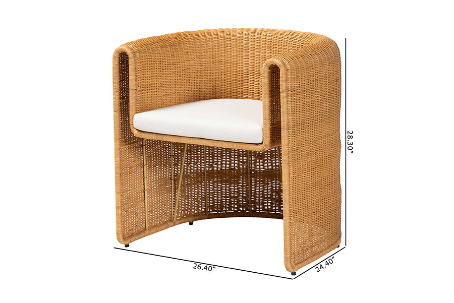 Rustic craftsmanship meets bold geometry with the Katrina dining chair. Made in Indonesia, this bohemian piece is handcrafted from sustainably sourced natural rattan. Its classic barrel silhouette presents a smooth rounded edges from every angle while the arms encourage casual relaxation. The Katrina will arrive fully assembled and is fitted with a removable seat cushion padded with plush foam and upholstered in sumptuous fabric. Employing a unique exotic take on classic design, the Katrina dining chair adds a tranquil feel to any setting.