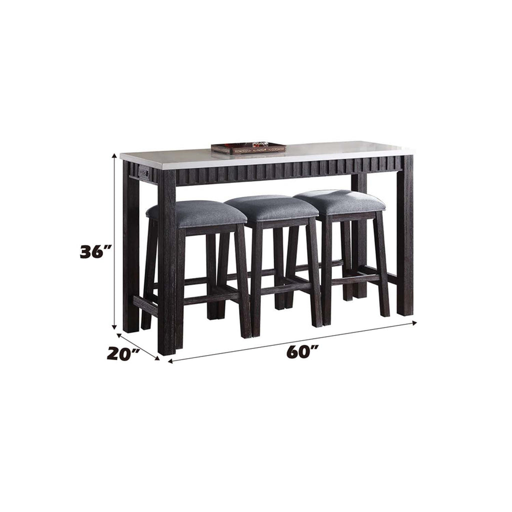 Simple, smart, and stylish, the Necalli counter height set is the perfect solution for small spaces. The compact rectangular table has a smooth marble top that stands out in lovely contrast with the weathered espresso finish of the wooden sled base. A subtle decorative trim along the table apron adds just the right amount of detail to this piece. Three matching stools with amply padded seats fit neatly under the table to maximize your space.
