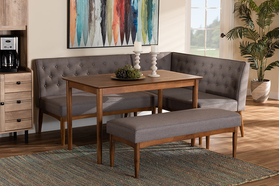 Invigorate your dining space with the effortless style and smooth seats of the Mario dining nook set. Made in Malaysia, this set includes one armless bench, one corner bench, one backless bench, and one table. Each piece is constructed from sturdy wood in a warm walnut brown finish. The seats are padded with plush foam and upholstered in soft fabric for exceptional comfort with every meal. Requiring assembly, the crisp, rectangular tabletop ensures ample elbow room for each member of the table. Slim, tapered legs lend a touch of mid-century charm. A perfect addition to smaller dining rooms, the Mario dining nook set elevates the feel of any space.