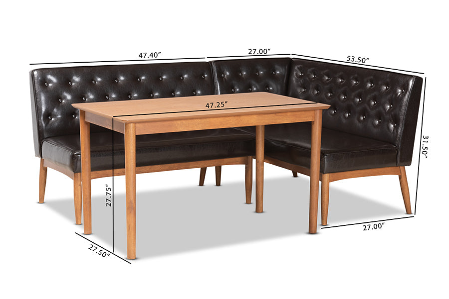 Invigorate your dining space with the effortless style and smooth seats of the Mario dining nook set. Made in Malaysia, this set includes one armless bench, one corner bench, and one table. Each piece is constructed from sturdy wood in a warm walnut brown finish. The benches are padded with plush foam and upholstered in smooth faux leather for exceptional comfort with every meal. Requiring assembly, the crisp, rectangular tabletop ensures ample elbow room for each member of the table. Slim, tapered legs lend a touch of mid-century charm. A perfect addition to smaller dining rooms, the Mario dining nook set elevates the feel of any space.