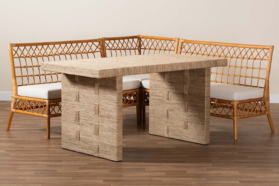 An air of exotic bliss permeates the mood of every meal with the lovely Marlisa dining nook set. Made in Indonesia, this bohemian set includes two benches, one corner seat, and one table. Each seat features a handcrafted rattan frame topped with plush cushions upholstered in lavish fabric for superb comfort. The Marlisa will arrive fully assembled and features a broad, rectangular tabletop to accommodate each member of the table. Presenting crisp geometric charm in every facet, the Marlisa dining nook set creates an outstanding centerpiece for any occasion.