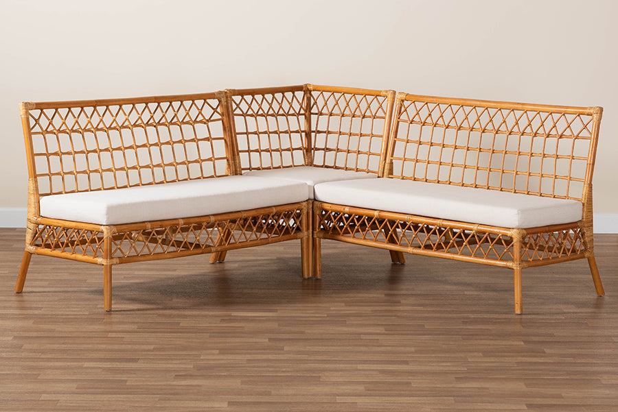 Delight in an air of exotic bliss for every meal with the remarkable Ayla dining nook banquette set. Made in Indonesia, this bohemian set includes two benches and one corner seat handcrafted from natural rattan. Each seat is fitted with a plush cushion padded with foam and upholstered in sumptuous fabric for superb dining comfort. The Ayla will arrive fully assembled and features an openwork design interlaid with crisp geometric embellishments for an airy yet refined poise. Angled legs lend a touch of rustic charm, making the Ayla dining nook banquette set a wonderful centerpiece of any occasion.