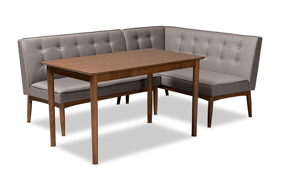 Enjoy weekend brunches and casual dinners with the Mabel dining nook set. Featuring a clean, streamlined design, the Mabel set includes one table, one armless bench, and one corner bench. Each piece is built from wood in a walnut brown finish, ensuring strength and durability. The benches are upholstered in a soft, grey polyester fabric that is easy to coordinate with a wide range of color palettes. Inspired by stylish mid-century modern design, the pieces showcase button tufting and tapered legs. This cozy set is designed to be placed in the corner of your kitchen or dining area, allowing you to maximize your space while still maintaining a chic set-up. The Mabel dining nook set is made in Malaysia and requires assembly.