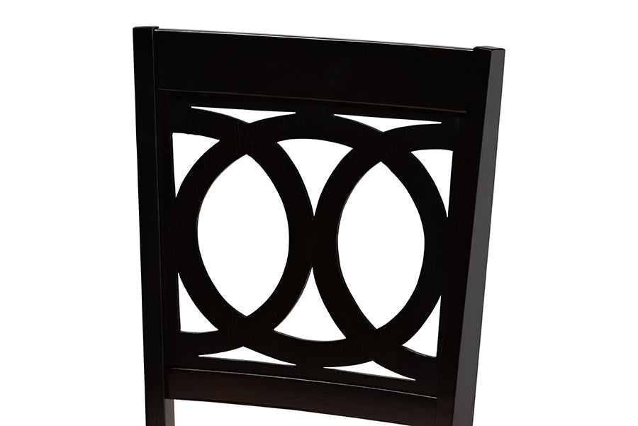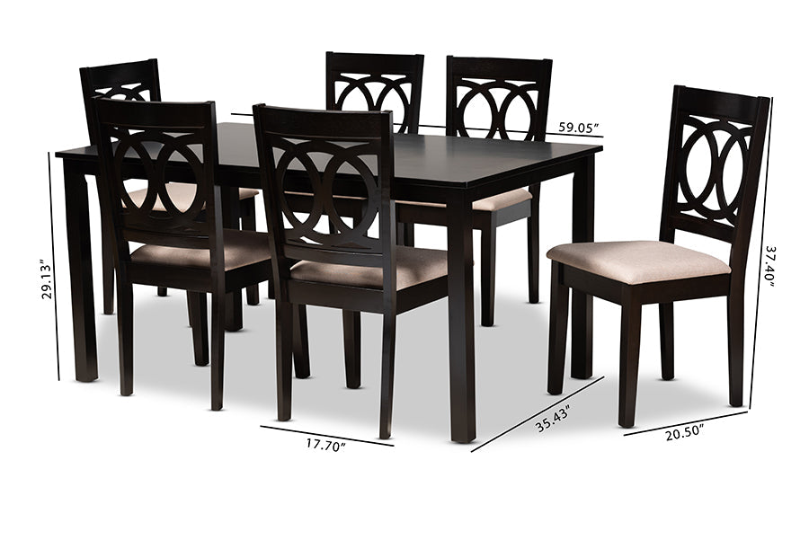 A fusion of traditional design elements and modern craftsmanship make the Aspen 7-piece dining set a stunning addition to any dining space. Constructed from solid rubberwood in an espresso finish, this dining set includes one table and six chairs, each upholstered in a light polyester fabric that complements the dark wood finish. Padded with foam for the utmost comfort as you enjoy long dinners, each chair features a striking cut-out design on its back for enhanced visual appeal. Comfortable and stylish, the Aspen set is sure to elevate any dining experience. The Aspen 7-piece dining set is made in Malaysia and requires assembly.