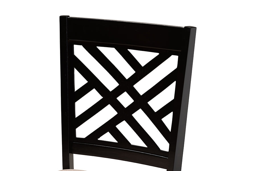 Redefine your dining space with the elegance and comfort of the Iden 7-piece dining set. Constructed from solid rubberwood in an espresso finish, this dining set includes one table and six chairs, each upholstered in a light polyester fabric that complements the dark wood finish. Padded with foam for the highest level of dining comfort, each chair features a stunning cut-out back for enhanced visual appeal. Whether used for chic dinner parties or casual family dinners, the Iden set is sure to elevate any dining experience. The Iden 7-piece dining set is made in Malaysia and requires assembly.