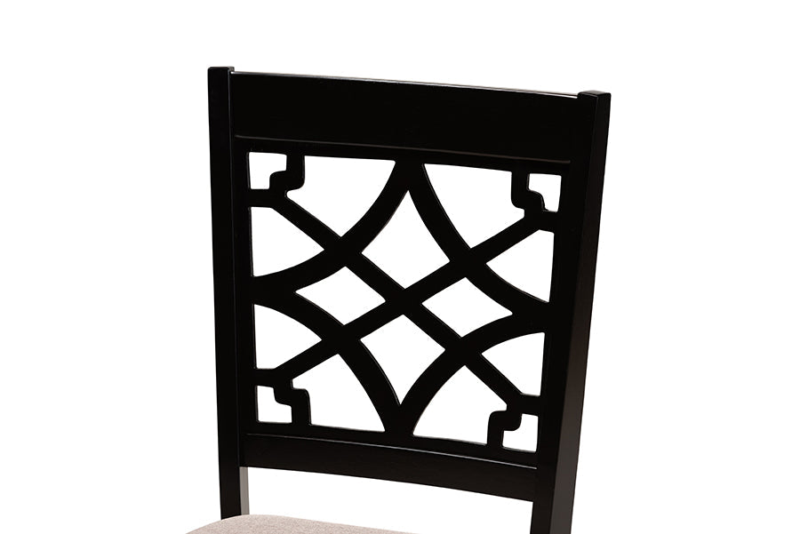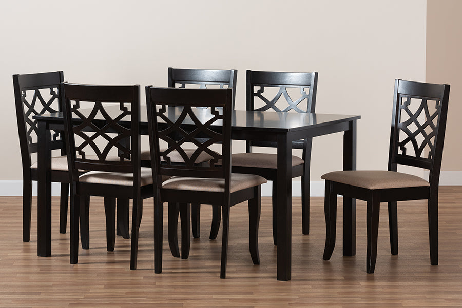 Cultivate an air of elegance in your dining room with the Meike dining set. This dining set is made in Malaysia and is constructed from solid oak wood. Assembly is required and this set includes one table with six chairs, each upholstered in a light fabric that complements the rich espresso brown finish on the wood. Designed with both comfort and style in mind, each chair features a plush foam-padded seat, as well as an exquisite cut-out design on its back. Saber legs add a classic, refined touch. Equally suitable for both chic dinner parties and casual family dinners, the Meike dining set is sure to enhance any dining experience.