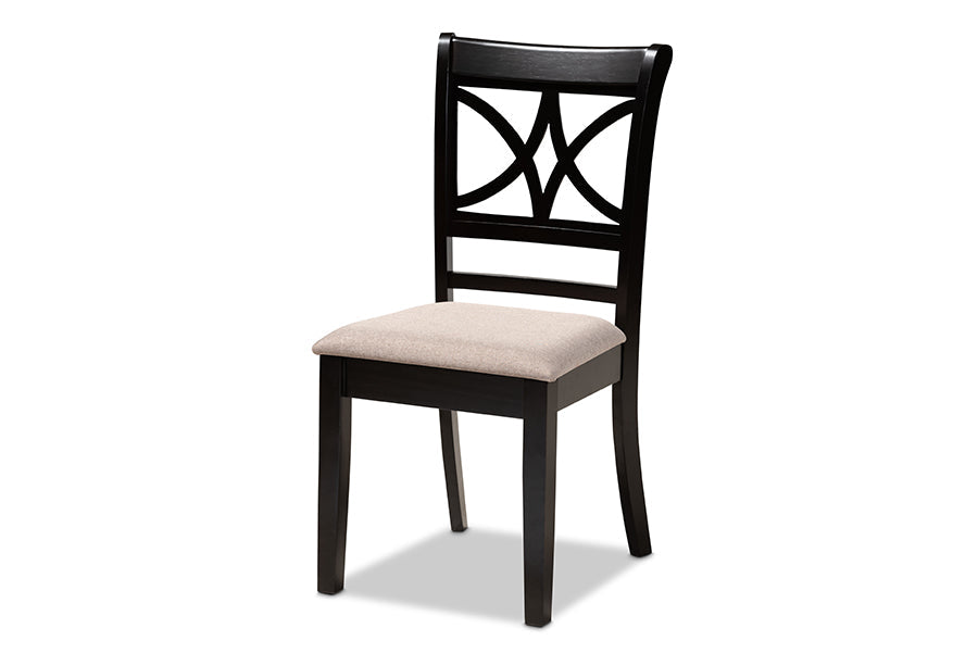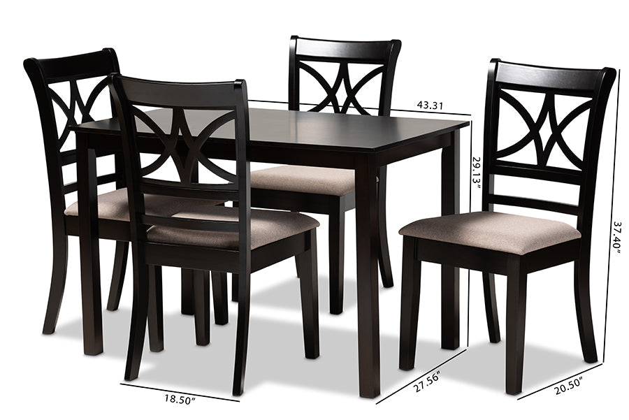 Elevate your dining space with the sophisticated design of the Oreille dining set. Made in Malaysia, this dining set is constructed from solid wood in an espresso brown finish and comfortably sits up to four. The Oreille requires assembly and includes one table with four foam-padded chairs, each upholstered in a soft fabric. The unique cut-out design on the back of the chairs allows the Kassidy to stand out while allowing light to flow through the dining room. Providing an optimal balance of style and comfort, the Oreille dining set is a perfect fit for both formal dinner parties or casual meals.