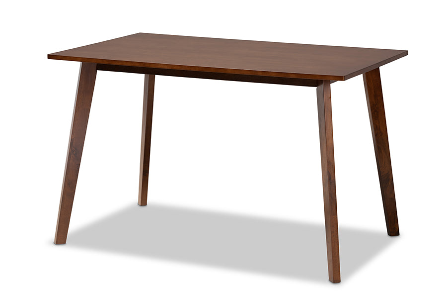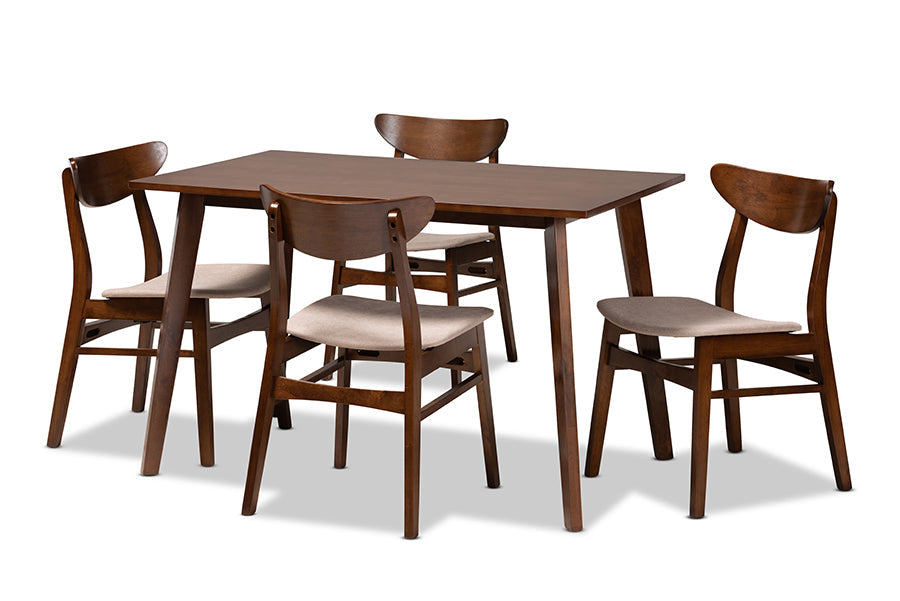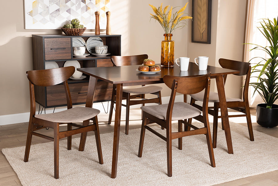 Efficient and streamlined design make the Lauren dining set a refined addition to any dining space. Made in Malaysia, the Lauren is constructed from durable wood and comfortably seats up to four. The walnut brown finished wood and rectangular tabletop lend modern style while giving each member of the table plentiful elbow room. Assembly is required and each chair is padded with foam underneath a layer of soft fabric for comfort. With its compact size, the Lauren dining set is well suited for smaller nooks and dining spaces.