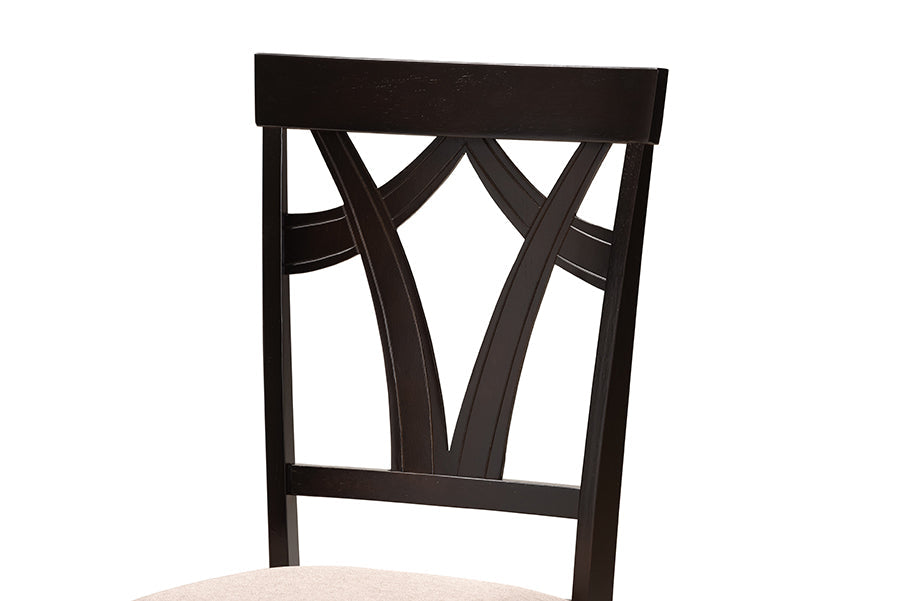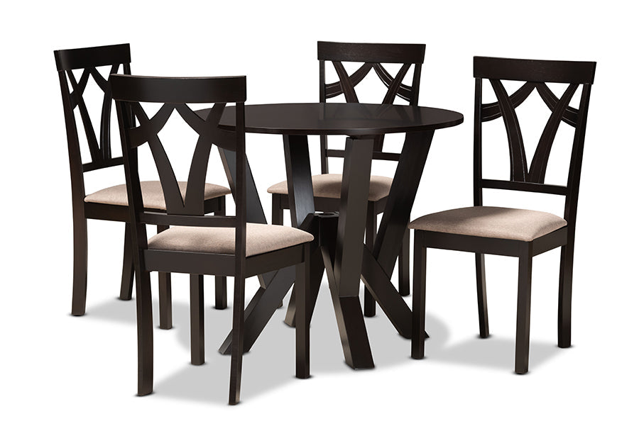 Elevate your dining space with the unique geometric design of the Leonice dining set. Made in Malaysia, this wooden set includes one table and four chairs, each upholstered in a light fabric that complements the dark brown wood finish. Designed with both comfort and style in mind, each chair features a plush foam-padded seat, as well as a striking cut-out design on its back. The round tabletop is supported by an intersecting base, creating a chic, sculptural effect. Requiring assembly, the Leonice dining set is well suited for both casual and formal dining.