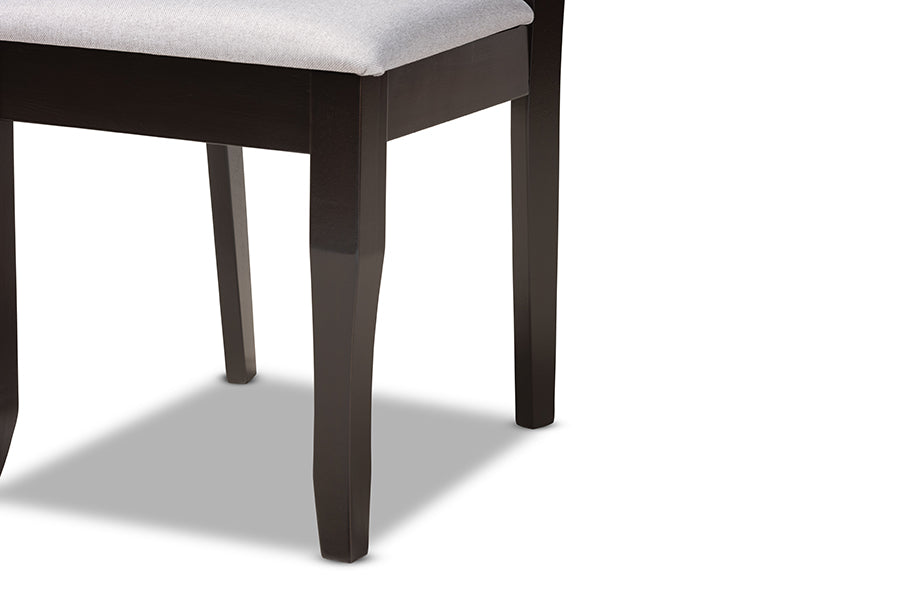 Cultivate an air of elegance in your dining room with the Meike dining set. Made in Malaysia, this wooden set includes one table and six chairs. Each chair is upholstered in a light fabric that complements the rich dark brown finished wood. Designed with both comfort and style in mind, each chair features a plush foam-padded seat, as well as an exquisite cut-out design on its back. Saber legs add a classic, refined touch. Requiring assembly, the large, rectangular tabletop provides plenty of elbow room for each member of the table. Equally suitable for both chic dinner parties and casual family dinners, the Meike dining set is sure to enhance any dining experience.