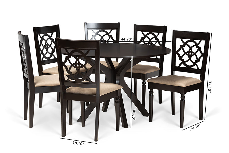 Contemporary style meets modern comfort with the Milena dining set. Made in Malaysia, the Milena includes six chairs and one table constructed from sturdy wood finished in a rich dark brown. Each chair features a unique cut-out design on its back and is fitted with a foam-padded cushion upholstered in a smooth sand tone fabric. Requiring assembly, the circular tabletop provides ample elbow room for each member of the table. Perfect for both casual and formal occasions, the Milena dining set easily elevates any dining experience.