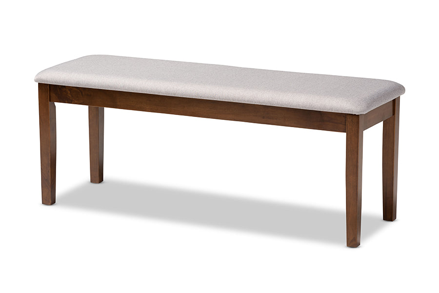 Timeless design is merged with modern comfort in the Athena dining set. Made in Malaysia, this wooden set is comprised of four chairs, one dining bench, and one table. Each seat is upholstered in a smooth grey fabric that complements the warm walnut brown finish and is fitted with plush foam padding for superb comfort. An optimal balance of comfort and style, each chair features a striking cut-out design on its back for enhanced visual appeal. Requiring assembly, the rectangular tabletop provides ample elbow room for each member of the table. Whether used for chic dinner parties or casual family dinners, the Athena dining set is sure to elevate any dining experience.
