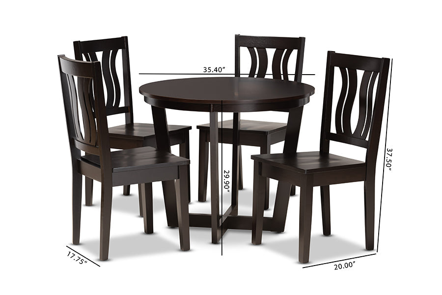 Featuring a unique, visually striking design, the Leni dining set adds elegance to any dining space. Made in Malaysia, this wooden set includes four chairs and one table showcasing a rich dark brown finish. Each chair features a refined geometric cut out design on its backrest for added visual appeal, while a scoop seat lends casual comfort. Requiring assembly, the circular tabletop provides ample elbow room for each member of the table. Emanating graceful charm, the Leni dining set is an exceptional addition to the modern home.