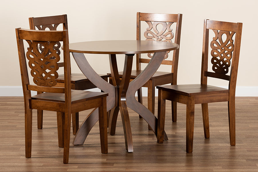 Imbue your dining space with the elegance of the finely crafted Manhattan dining set. Made in Malaysia, this wooden set includes four chairs and one table showcasing a warm walnut brown finish. Each chair features a stunning geometric cut out design on its backrest for added visual appeal, while a scoop seat lends casual comfort. Requiring assembly, the circular tabletop provides ample elbow room for each member of the table. Elegant and comfortable, the Manhattan dining set elevates any dining experience.
