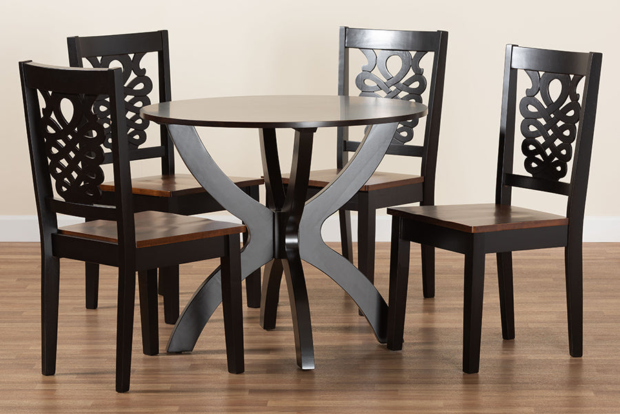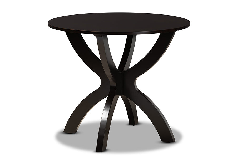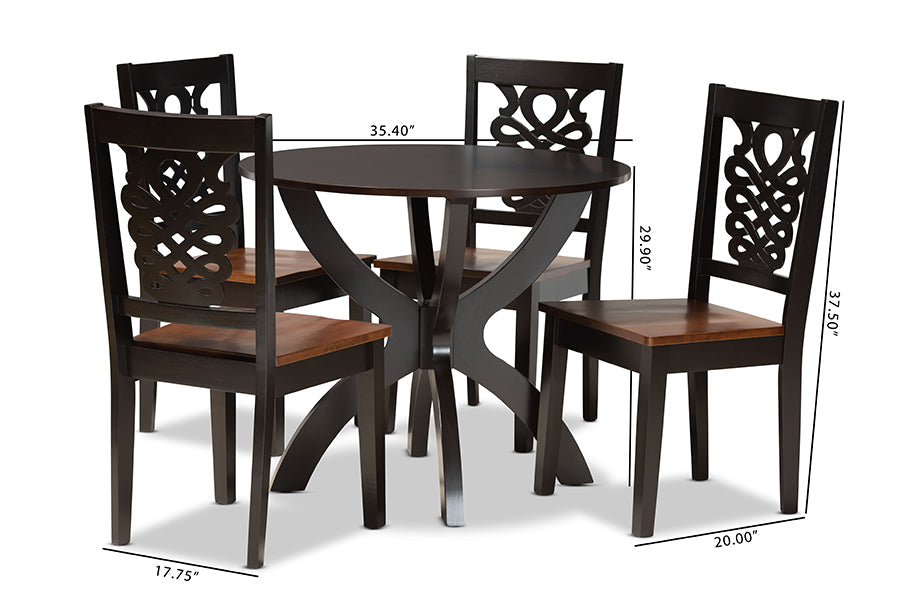 Imbue your dining space with the elegance of the finely crafted Manhattan dining set. Made in Malaysia, this wooden set includes four chairs and one table showcasing a rich dark brown finish. Each chair features a stunning geometric cut out design on its backrest for added visual appeal, while a walnut brown finished wood scoop seat lends casual comfort. Requiring assembly, the circular tabletop provides ample elbow room for each member of the table. Elegant and comfortable, the Manhattan dining set elevates any dining experience.